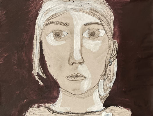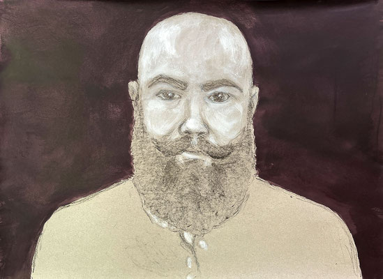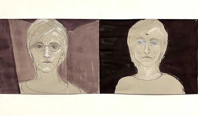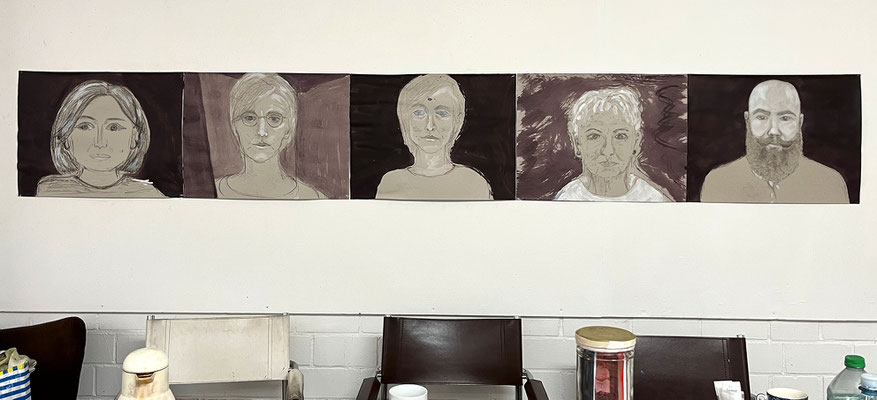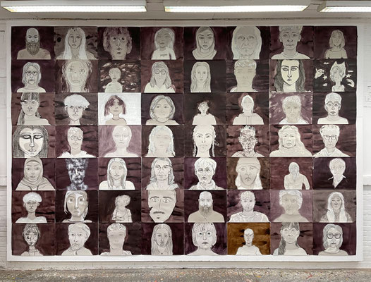 Bis jetzt (Mitte Mai 2025) ist die Arbeit ungefähr zu drei Vierteln fertiggestellt. Jedes Portrait misst 48 x 63 cm. Die gesamte Arbeit wird voraussichtlich eine Größe von etwa 4 x 5 m erreichen. Alle Selbstportraits werden mit den gleichen Materialien hergestellt (Zeichenkohle, selbst hergestellte Temperafarbe, Acrylfarbe, grauer Karton).